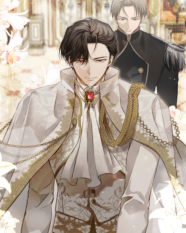 حبس الدوق كيوال أنفاسه وهو ينظر إلى الدوق الأكبر . على عكس شفتيه اللتين كانتا تبتسمان بكسل، كانت عيناه الحمراوان ضيقتين و حادتين، وكأنه كان يخمِّن ما يدور في ذهن الدوق كيوال .