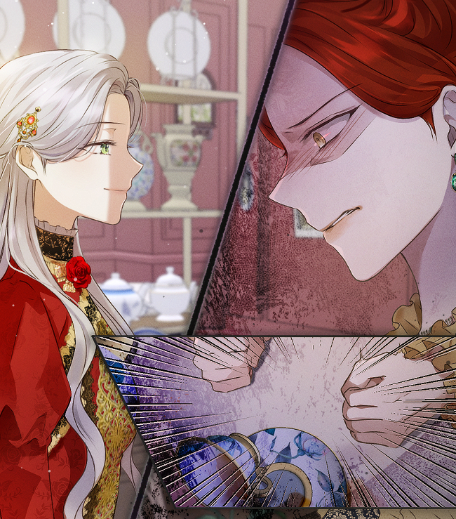 بمجرد أن أنهت الإمبراطورة كلامها، دفعت طبق الحلويات نحو أوليڤيا. وكأنها كانت تتوقع ذلك، تراجعت أوليڤيا خطوة واحدة. كان صوت انكسار الأطباق مدويًا .
